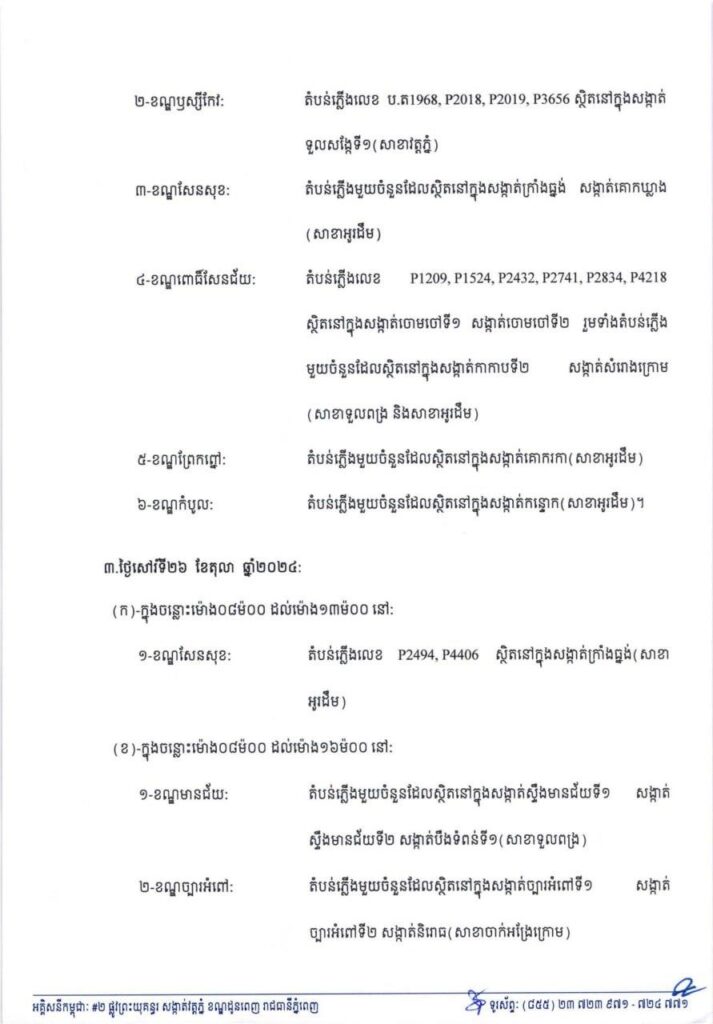 EDC ជូនដំណឹងពីការរអាក់រអួលចរន្ត តាមតំបន់មួយចំនួនចាប់ពីថ្ងៃនេះ ដល់ថ្ងៃទី២៧ ខែតុលា ដើម្បីរុះរើគន្លងខ្សែបណ្តាញ ផ្លាស់ប្តូរ តម្លើងបរិក្ខារ ងាយស្រួលដល់ការដ្ឋានពង្រីកផ្លូវ…