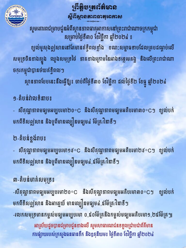 ក្រសួងធនធានទឹក ជូនដំណឹងអំពីស្ថានភាពធាតុអាកាសនៅកម្ពុជា សម្រាប់ថ្ងៃទី៣០ ខែវិច្ឆិកា ឆ្នាំ២០២៤, សូមថែរក្សាសុខភាព អាកាសធាតុចាប់ផ្តើមចុះត្រជាក់…