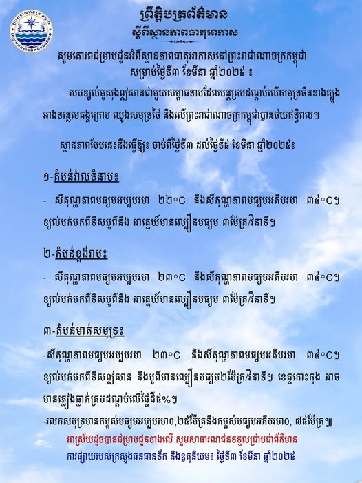 ក្រសួងធនធានទឹក ជូនដំណឹងអំពីស្ថានភាពធាតុអាកាសនៅកម្ពុជា សម្រាប់ថ្ងៃទី៣ ខែមីនា ឆ្នាំ២០២៥…